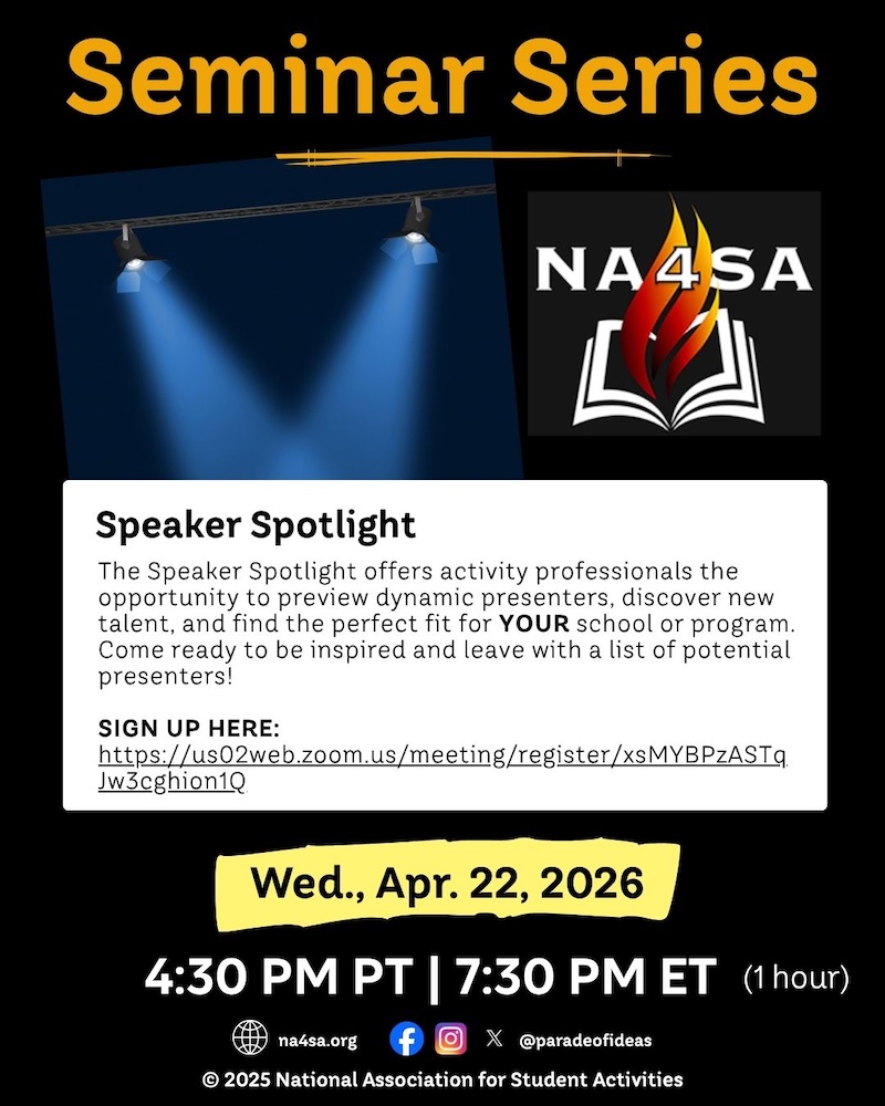 We invite EVERYONE interested in student activities, leadership training, and speaking/presenting to explore our website and to become an active part of YOUR National Association for Student Activities, NA4SA!