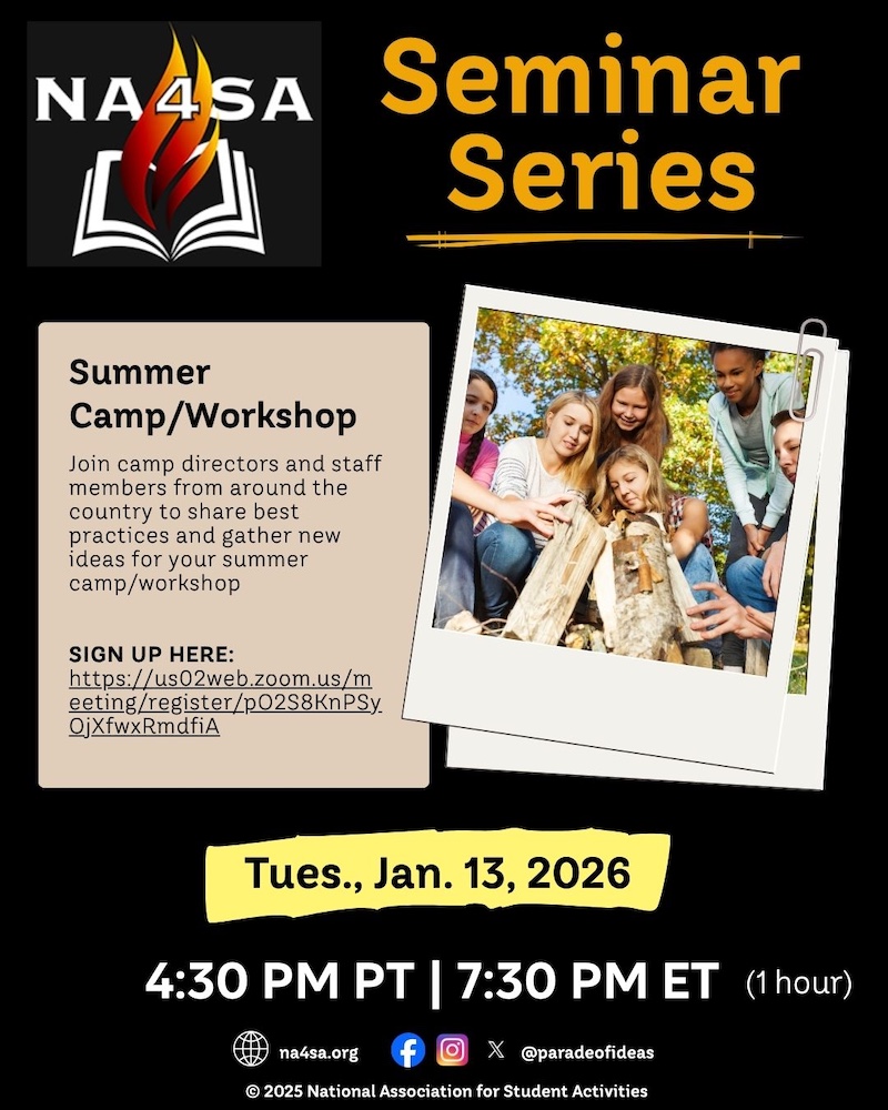 Throughout the school year from September to May, our virtual NA4SA Seminar Series explores an area or topic of interest to Student Activity Professionals. There is NO COST to participate in our Seminar Series and you can attend one seminar or come to them all!